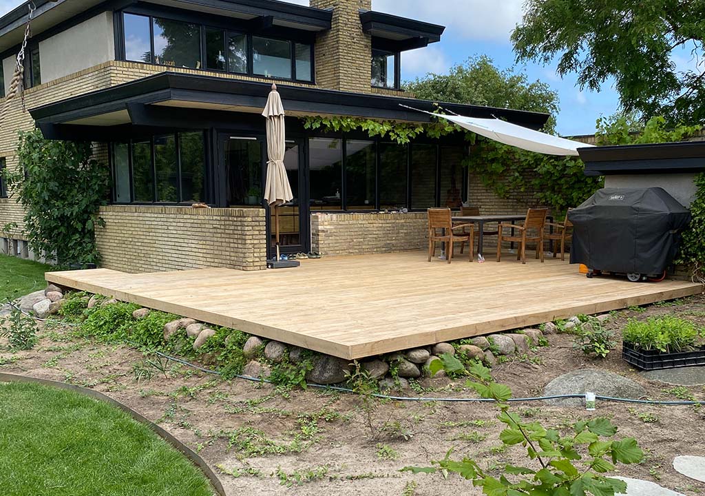 Skovhaver.dk har løbende gennem 2023 og 2024 valgt lufttørret egetræ som materiale til deres terrasser, gangbroer og højbede.