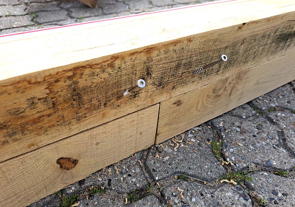 OBS: nogle vælger at montere det øverste lag fra næstsidste lag og op. Så er skruerne ikke så synlige.