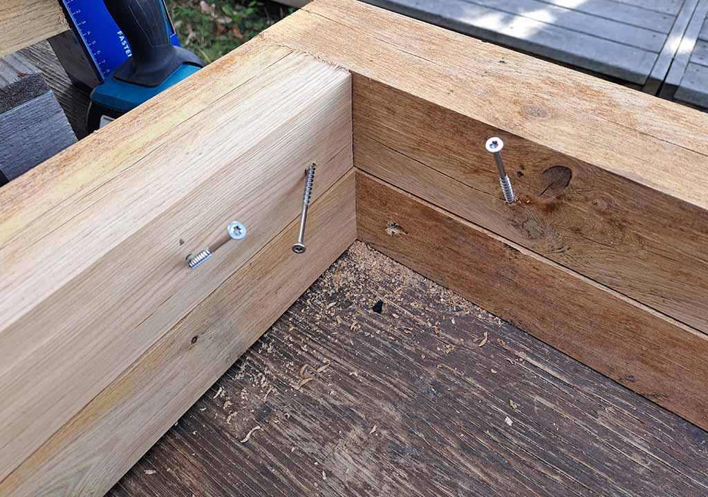 Hjørnerne skrues sammen med en vandret skråskrue.