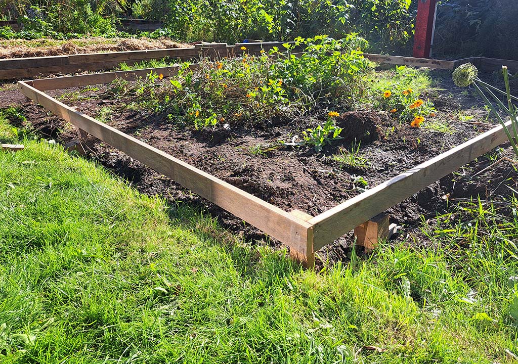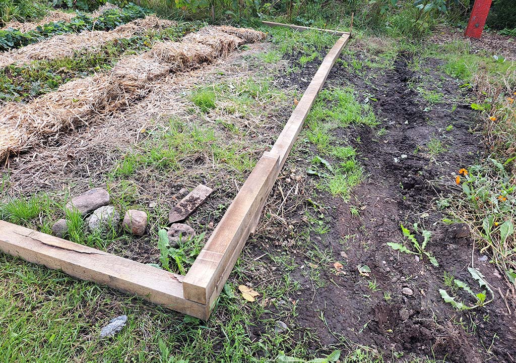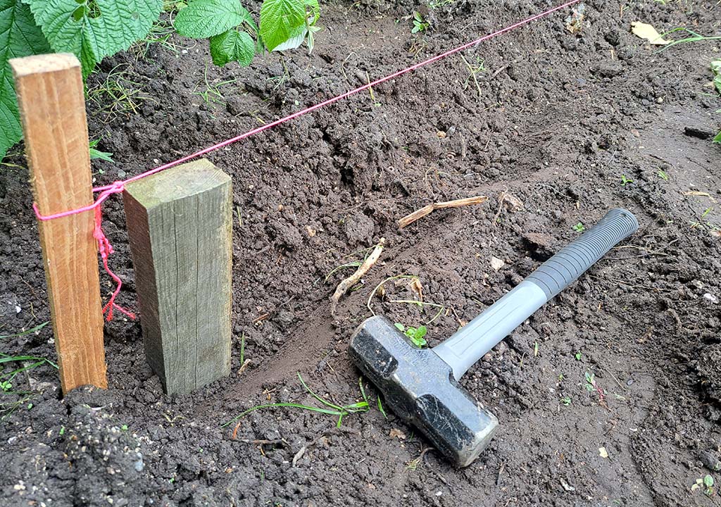 Start med at slå pæle i alle hjørner. Sluthøjden skal være ca 15 cm over niveau.