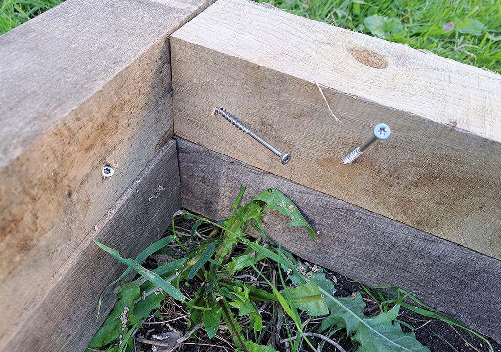 Alle brædder skal til slut være montere med 2 skruer i hver ende og evt. 1 skrue i midten (hvor de møder en pæl). Husk at der altid skal forbores.