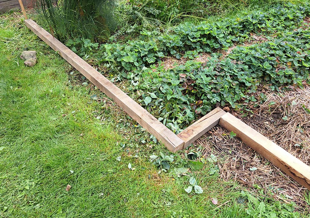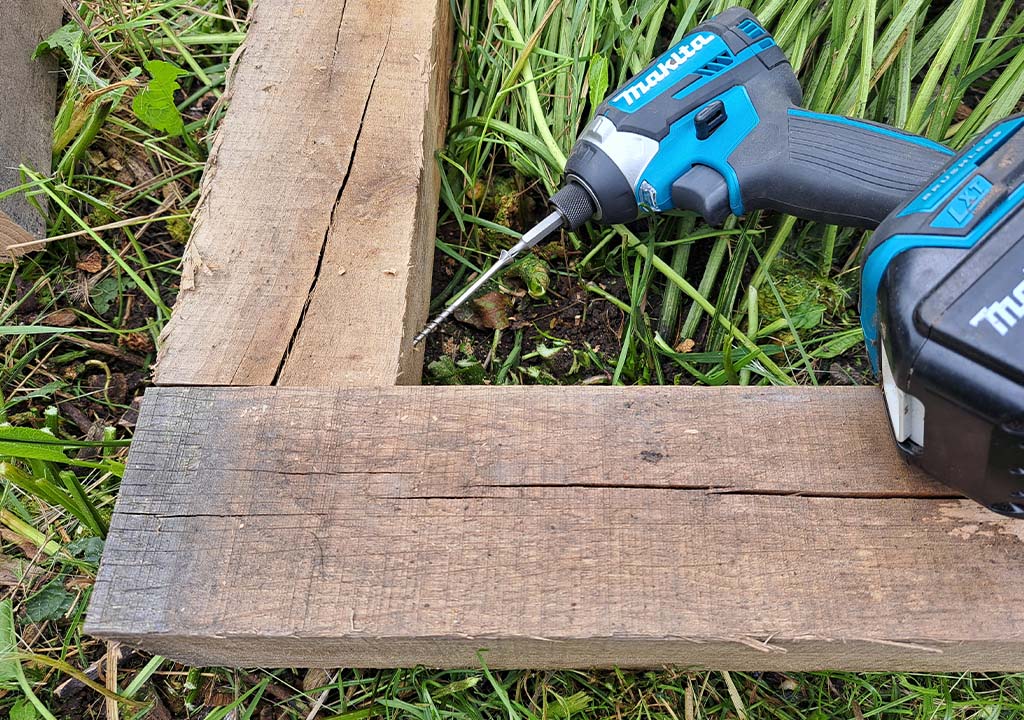 Første lag stolper lægges på jorden så de indrammer det ønskede område. Hjørnerne fastgøres med en skråskrue.