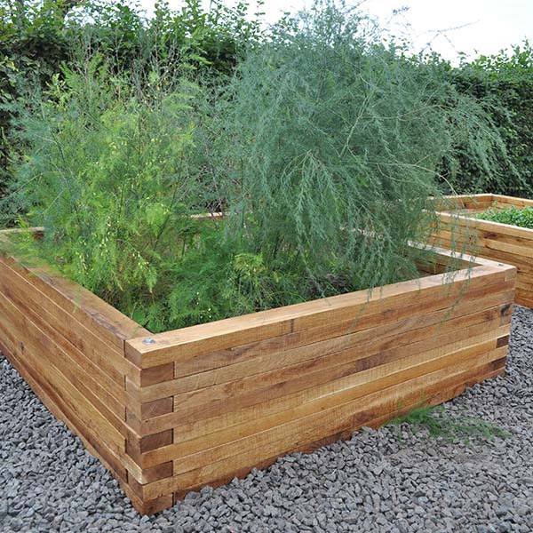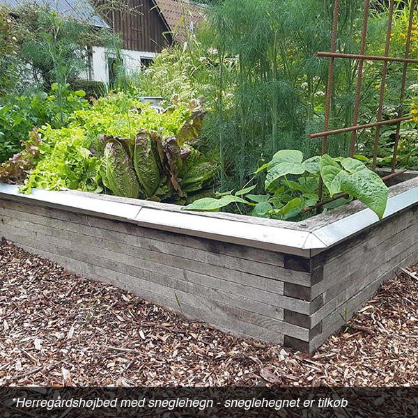 BIOBYGs Herregårdshøjbed laves i savskårne egeplanker. Dvs. at overfladen, før evt. pudsning, er lidt grovere end på høvlet træ, og at plankerne svinger lidt på mål. Ønsker man charmerende og levende højbede, kan man roligt læse videre. Ønsker man et mere ensartet udtryk, er vores Hertugindemodel i høvlede egetræsplanker et godt bud. Herregårdsmodellen er en elegant og meget solid konstruktion. Den laves af 3,5×7 cm planker, der vender, så siderne er 7 cm brede. Herregårdshøjbedet kan tåle at stå i det offentlige rum og har, uden vedligeholdelse, en forventet levetid på over 20 år.