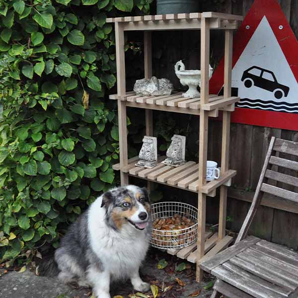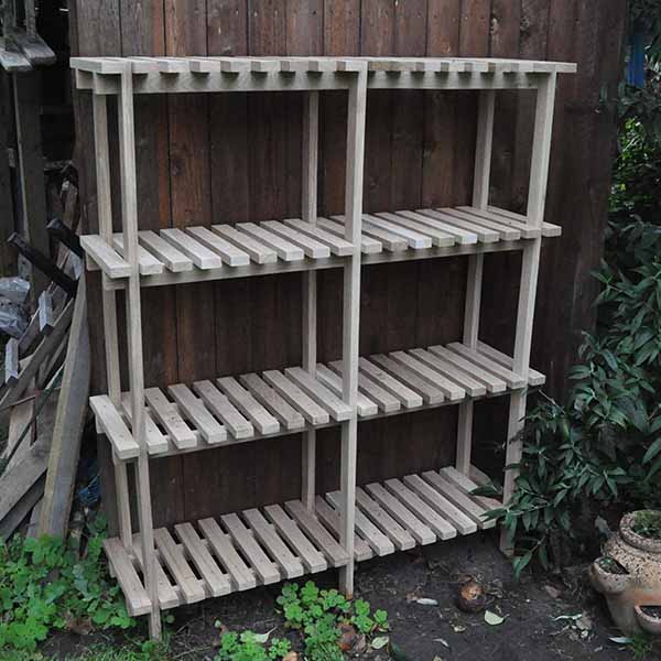 BIOBYGs udereol eller havereol model Mursejler er lavet i lufttørret høvlet egetræ. Den patinerer smukt og har meget lang levetid (+ 15 år) uden nogen former for behandling eller vedligeholdelse. Reolen kan evt. slibes let med sandpapir hvert 4 – 5 år.